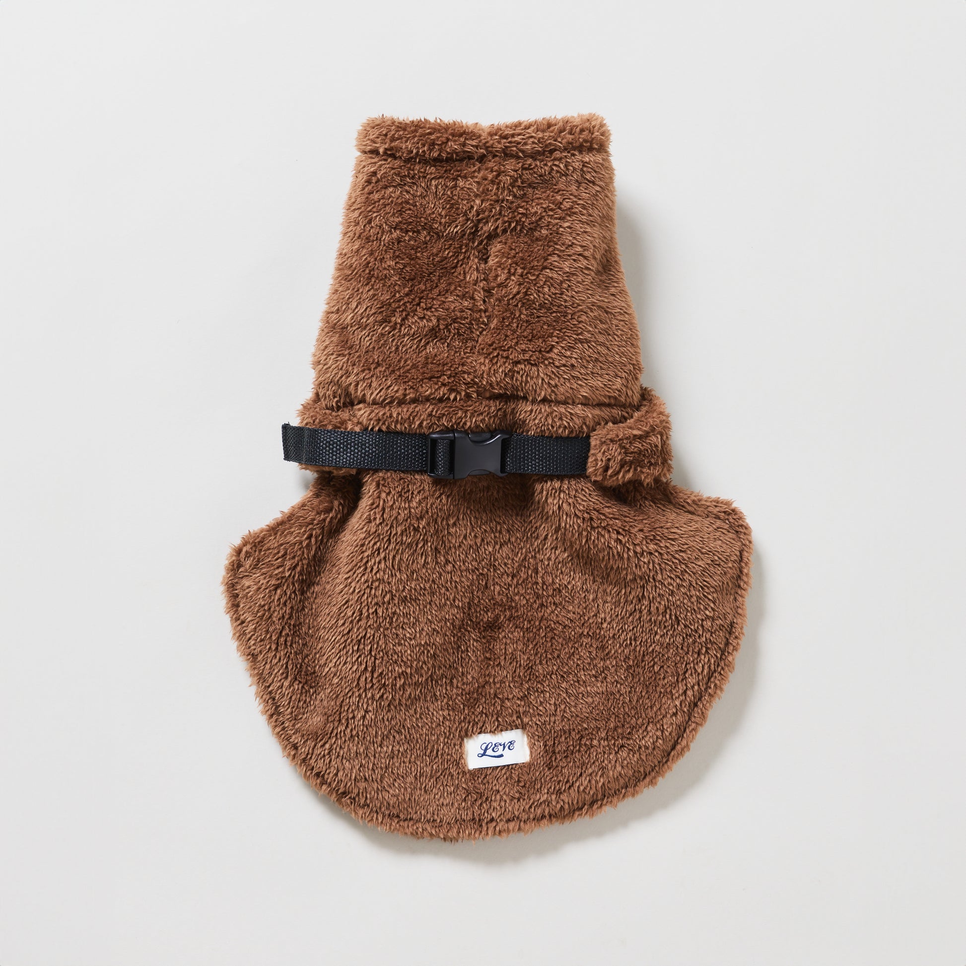 ボリューム満点の毛足が特徴のシャギーボア素材を使用しています。首元までたっぷりボアでしっかり暖かく、軽くて動きやすいのがポイント。頭から被せてお腹側からベルトを回し留めるだけの着脱ストレスフリーなデザインです◎